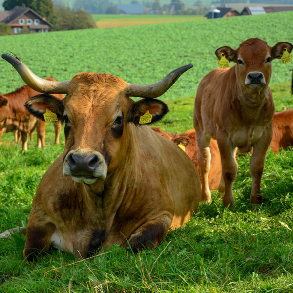 Die Tiere auf dem Naturabeef-zertifizierten Hof wachsen in Mutterkuhhaltung auf. Das bedeutet, die Jungtiere leben mindestens zehn Monate zusammen mit ihren Müttern in der Herde. Viel Auslauf auf der Weide und ein grosszügiger Stall sind Teil ihres Lebens.
