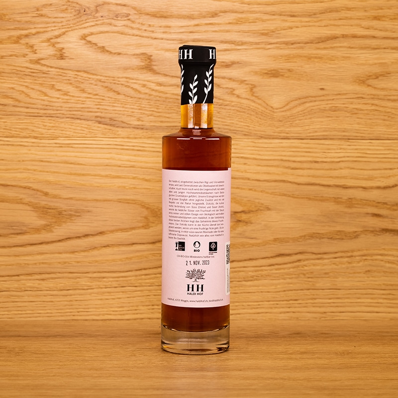 Für diesen Essig werden alte Sorten von Hochstammobstbäumen verwendet. Der Haldihof schreibt Biodiversität gross, was sich in der grossen Arten- und Sortenvielfalt auf dem Hof widerspiegelt. Gartenrotschwanz, der selten gewordene Neuntöter oder die Ringelnatter sind Tiere, die auf dem Hof wieder ein Zuhause gefunden haben.