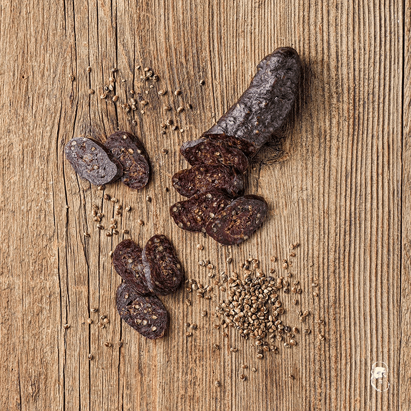 Der Rindsalsiz ist saftig im Biss und hat einen nussig, würzigen Fleischgeschmack. Dank der Hanfnüsse enthält dieses hochwertige Stück nicht nur tierische, sondern auch pflanzliche Proteine. Inklusive Ballaststoffe und Omega 3 Fettsäuren. Dafür ohne Zusatzstoffe und ohne Pökelsalz und nicht zu vergessen auch ohne THC. Ein Spitzenprodukt – für Genuss und Gesundheit!