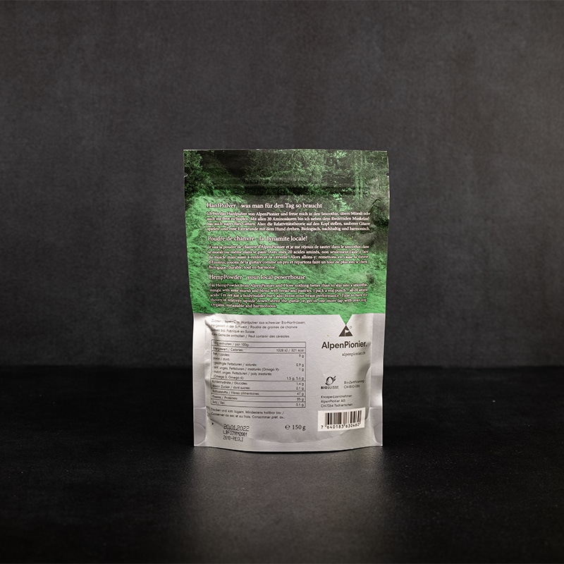 Bio Hanfpulver ist der Proteinkraftstoff pur. Das Pulver hat einen Proteinanteil von 35 %. Und zudem ist es ballaststoffreiche: Mit zwei Esslöffeln, einer Menge von ca. 50 g, deckt man bereits die empfohlene Tagesmenge in absolut gesunder Form ab. Gewachsen ist der verwendete Hanf in einer wilden, mageren Alpenregion um Tschiertschen im Schanfigg, wo schon die Urgrossväter Hanf angebaut haben.