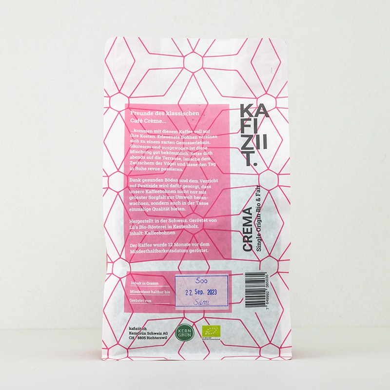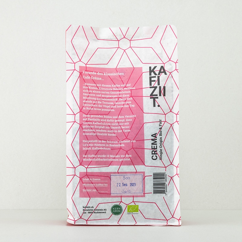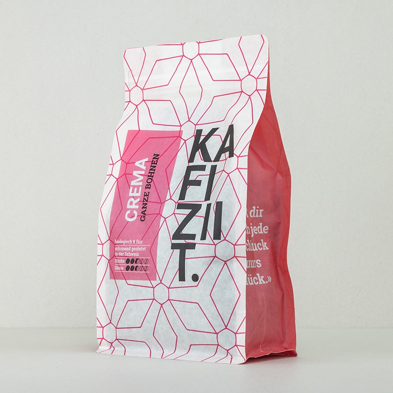 Um den Inhalt zu schützen und Aromaverluste möglichst zu vermeiden, müssen bei der Verpackung gewisse Kompromisse hinsichtlich der Umwelt eingegangen werden. Wir haben uns für die nachhaltigste Möglichkeit, die uns bekannt ist, entschieden. Aussen zertifiziertes Papier, innen strapazierfähiger Kunststoff. UV-Licht und Sauerstoff bleiben dank wasserbasierten Schutzlack draussen. Damit wird auch komplett auf Lösungsmittel verzichtet.