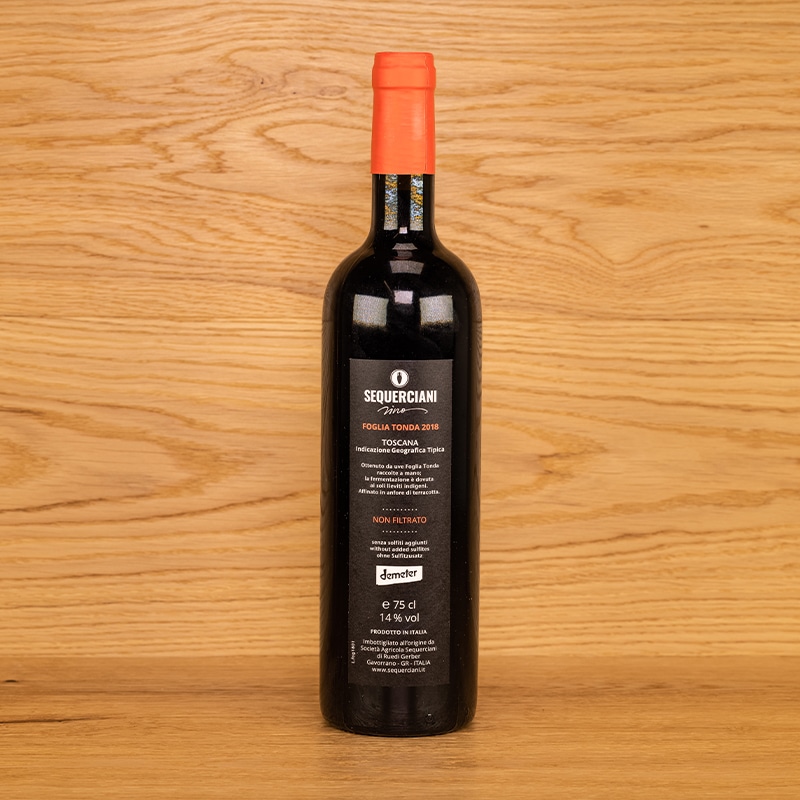 Foglia Tonda hat ihren Namen von der Kreisform des Blattes. 1887 wurde die Traubensorte das erste Mal in der Literatur erwähnt. Damals fügte man dem Wein aus Foglia Tonda-Trauben noch Sangiovese-Trauben hinzu, um ihm mehr Gerbstoffe und intensive Geruchsnoten zu verleihen. Sequerciani interpretiert die vergessen gegangene Sorte neu und keltert daraus diesen wundervollen, schweren Wein.